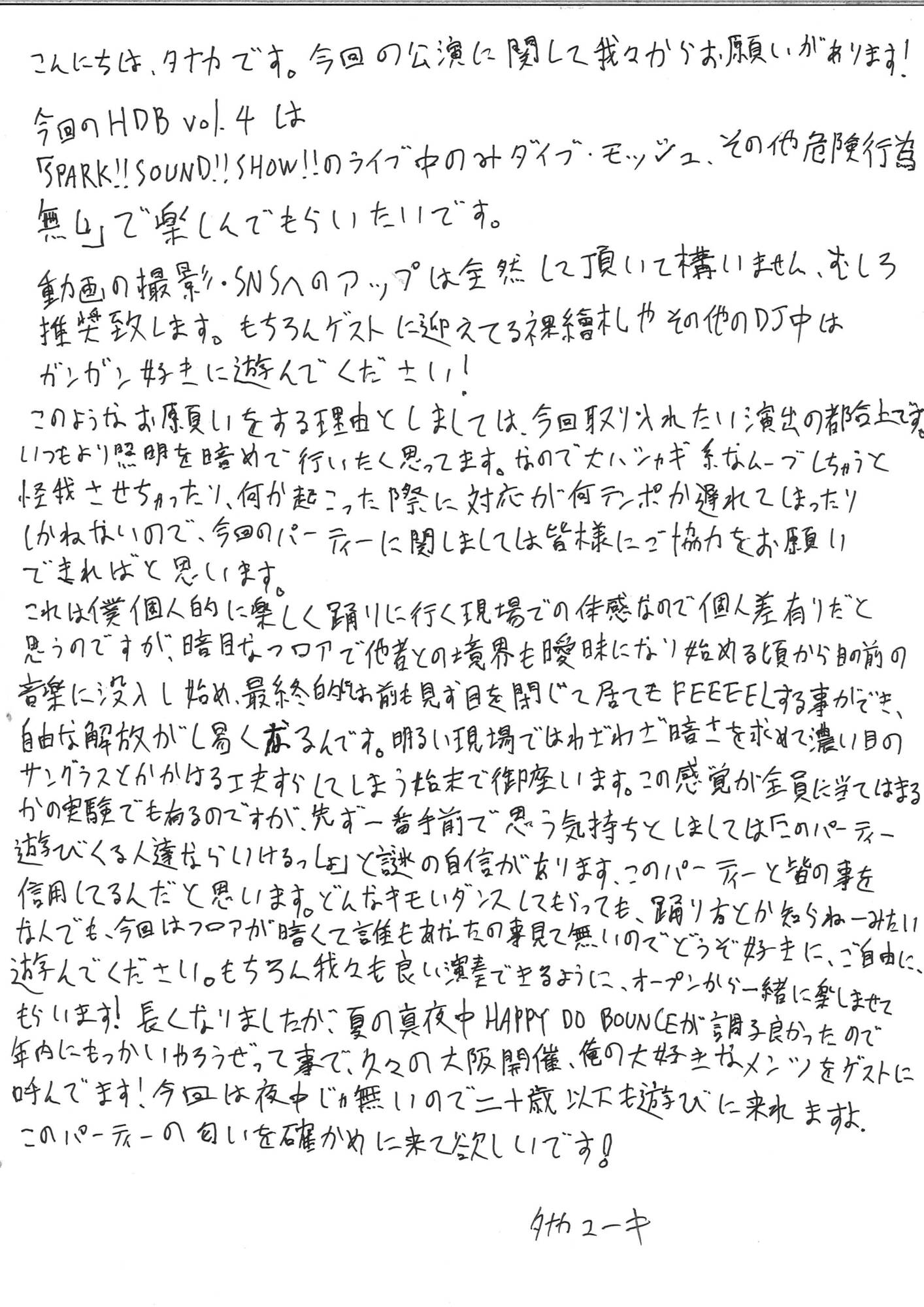 また、今回は演出上、フロアはもちろんステージも暗い予定です。ある程度の安全が担保された「ダイブ・モッシュ」も楽しんでもらうことを容認した空間をこちらは用意できない可能性が高いです。「禁止事項があるなら行かない。自由に遊びたい。」この気持ちを否定することはありません。ただ、例え、集客が整わなくても、こちらはスタンスを変えるつもりはございません(現状、HAPPY DO BOUNCE Vol.4のみ)。以降のライブに関しては「通常通り」というのもおかしいですが、今回のようなお願いはしないつもりです(また同コンセプトがあったら、それはそれで)。